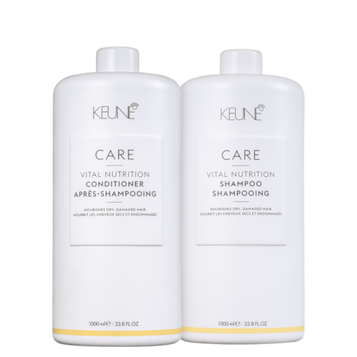 Kit com shampoo e condicionador, tamanho profissional, para cabelos secos e grossos. Keune Care Vital Nutrition Duo nutre, hidrata e repara os fios danificados.
