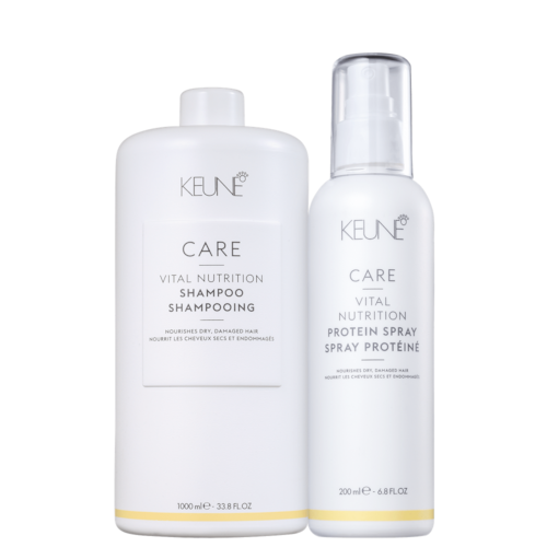 Kit com shampoo tamanho profissional e leave-in para cabelos secos e danificados. Kit Keune Care Vital Nutrition Salon Repair devolve vitalidade aos fios enquanto limpa e protege.