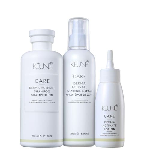 Kit Keune Derma Activate Trio conta com um novo complexo de minerais essenciais que aumentam a queratinização do cabelo durante o desenvolvimento para evitar a perda a partir da raiz, além de estimular a circulação sanguínea no bulbo capilar para o nascimento de novos fios com mais densidade e volume.