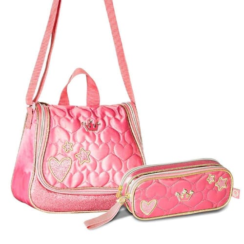 Atenção: imagens meramente ilustrativas.Contem:01 un - lancheira térmica rosa.01 un - estojo duplo rosa.A linha sweet queen combina o rosa, lilás e verde delicados com o poder do dourado, afinal, quem é que não gostaA lancheira da linha sweet queen é confeccionada em cetim com painel frontal em matelassê e detalhes em glitter.Garanta já a suaCaracterísticas da lancheira:Lancheira confeccionada em material poliéster.Com alça de mão.Com alça acoplar na mochila.Com puxador de ziper personalizado.Com detalhes em glitteres.Com revestimento interno térmico.Medidas aproximadas do produto:25 cm de largura.22 cm de altura.9 cm de profundidade. Medidas aproximadas do estojo:20cm - comprimento.10 cm - altura.7 cm - profundidade.