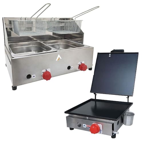 Conta com 1 Chapa Sanduicheira com Prensa de 30cm com 1 queimador e 1 Fritadeira Profissional de 2 Cubas 5 Litros cada, ambos produtos a gás.