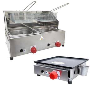Conta com 1 Chapa Sanduicheira de 30cm com 1 queimador e 1 Fritadeira Profissional de 2 Cubas 5 Litros, ambos produtos a gás.