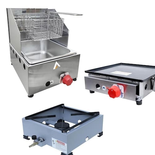 Conta com 1 Chapa Sanduicheira de 30cm com 1 queimador, 1 Fritadeira Profissional de 1 Cuba 5 Litros e 1 Fogão 1 queimador alta pressão, ambos produtos a gás.