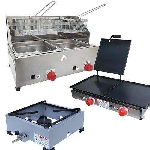 Conta com 1 Chapa Sanduicheira de 60 cm 2 queimadores com prensa, 1 Fritadeira Profissional de 2 Cubas 5 Litros e 1 Fogão 1 queimador alta pressão, ambos produtos a gás.