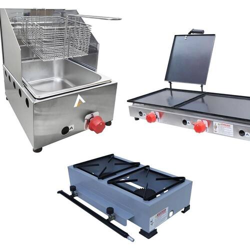 Conta com 1 Chapa Sanduicheira de 90 cm 3 queimadores com prensa, 1 Fritadeira Profissional de 1 Cuba 5 Litros e 1 Fogão 2 queimadores alta pressão, ambos produtos a gás.