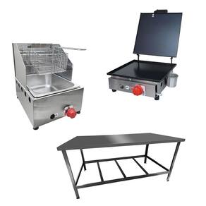 Esse Kit conta com Mesa de Manipulação para você preparar os alimentos, Fritadeira para fritura de suas porções e uma Chapa para preparação do seu cardápio!