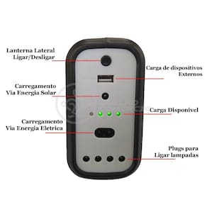 Kit Lanterna Placa Solar Carregador Portatil Energia Nº 26 Gdlite -A energia solar fornece corrente contínua para iluminação e carregamento de dispositivos móveis. Além de ser útil em momentos de necessidade, o sistema solar também é útil para eventos ao ar livre e viagens noturnas. Ele também vem com um painel solar com lanternas, lâmpadas LED e uma Placa solar. -utilizando energia solar renovável, este dispositivo de iluminação é obrigatório durante apagões e situações de emergência. Este dispositivo também é fácil de usar, muito intuitivo e pratico. Também foi comprovado que não há ruído, permitindo que você aprecie as atividades ao ar livre ou a paz e tranquilidade da noite. Características do Produto Cor: Preto Capacidade: 4500mAh Potência: 20w Entrada USB para carregar celulares ou outros equipamentos Material: Polipropileno e Componentes Eletrônicos. Produto 100% autêntico e de alta qualidade Possui indicador de nível de bateria Carregamento Adaptador de Tomada: Bivolt 110/220V - 50 / 60Hz Carregamento também por Placa Solar Entrada: DC 6V Saída: DC 9V Saída USB: 4x 5V = 0,5A Tempo de carregamento: 8-10 horas Tempo de Recarga no Sol: 12hs Tempo de trabalho: 7 à 12 horas A Lâmpada Led É 90 Lumens, A Luz Lateral É 150 Lumens Quantidade de Leds Lâmpada Bulbo: 8 Potência Lâmpada Bulbo: 3W Dimensões Altura x Largura x Comprimento : Medidas Placa Solar: 2 cm x 14 cm x 26 cm Medidas Lâmpada Bulbo: 9cm x 6cm Comprimento Cabo da Lâmpada Bulbo: 3 metros 40 cm Comprimento Cabo Fonte Controle Principal: 50 cm Conteúdo da embalagem 1 Controle Principal Acoplado no Painel , com entradas para Lâmpadas, Fontes, USB, Liga/Desliga. 3 Lâmpadas Bulbo 1 Placa Solar 1 Cabo USB 5 EntradasNº Certificado INMETRO: BR34048003Certificador: BVQI Marca: Gdlite