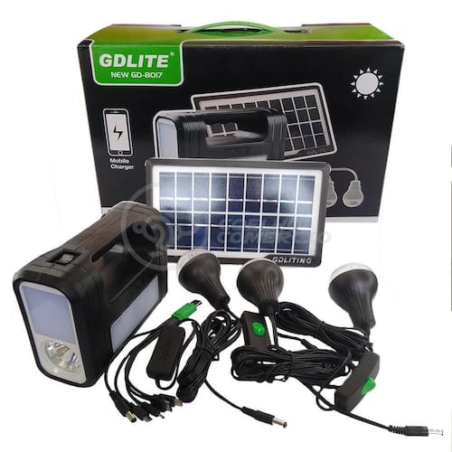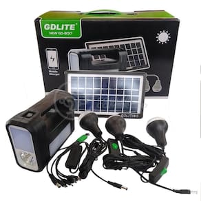 Kit Lanterna Placa Solar Carregador Portatil Energia Emergência Painel Lampadas Acampamento Camping Gdlite -A energia solar fornece corrente contínua para iluminação e carregamento de dispositivos móveis. Além de ser útil em momentos de necessidade, o sistema solar também é útil para eventos ao ar livre e viagens noturnas. Ele também vem com um painel solar com lanternas, lâmpadas LED e uma Placa solar. -utilizando energia solar renovável, este dispositivo de iluminação é obrigatório durante apagões e situações de emergência. Este dispositivo também é fácil de usar, muito intuitivo e pratico. Também foi comprovado que não há ruído, permitindo que você aprecie as atividades ao ar livre ou a paz e tranquilidade da noite. Características do Produto Cor: Preto Capacidade: 4500mAh Potência: 20w Entrada USB para carregar celulares ou outros equipamentos Material: Polipropileno e Componentes Eletrônicos. Produto 100% autêntico e de alta qualidade Possui indicador de nível de bateria Carregamento Adaptador de Tomada: Bivolt 110/220V - 50 / 60Hz Carregamento também por Placa Solar Entrada: DC 6V Saída: DC 9V Saída USB: 4x 5V = 0,5A Tempo de carregamento: 8-10 horas Tempo de Recarga no Sol: 12hs Tempo de trabalho: 7 à 12 horas A Lâmpada Led É 90 Lumens, A Luz Lateral É 150 Lumens Quantidade de Leds Lâmpada Bulbo: 8 Potência Lâmpada Bulbo: 3W Dimensões Altura x Largura x Comprimento : Medidas Placa Solar: 2 cm x 14 cm x 26 cm Medidas Lâmpada Bulbo: 9cm x 6cm Comprimento Cabo da Lâmpada Bulbo: 3 metros 40 cm Comprimento Cabo Fonte Controle Principal: 50 cm Conteúdo da embalagem 1 Controle Principal Acoplado no Painel , com entradas para Lâmpadas, Fontes, USB, Liga/Desliga. 3 Lâmpadas Bulbo 1 Placa Solar 1 Cabo USB 5 Entradas