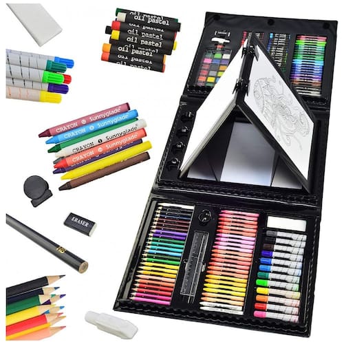 Conjunto de arte perfeita este ótimo conjunto de arte inclui todos os tipos de materiais para colorir e desenhar para artistas de todas as idades especialmente para qualquer criança que adora rabiscar ou quer inspirar e desfrutar da alegria de pintar. Várias ferramentas equipadas para atender a todas as suas necessidades de desenho. Brilhante e colorido para inspirar o lado criativo das crianças.