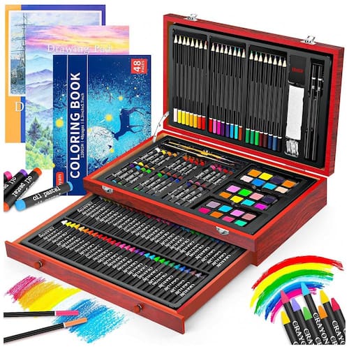 Kit de arte Deluxe de alta qualidade O estojo de arte Deluxe tem tudo o que você precisa para começar a criar em um estojo de madeira compacto Você pode começar a desenhar, colorir e pintar assim que abrir a caixa. Especialmente concebido com 2 grandes cadernos de desenho, 1 livro de colorir, 1 caixa de presente. Grande conjunto de arte para qualquer nível de artista. Este caso de arte é um ótimo presente para adultos e crianças, meninas e meninos, eles vão se divertir muito