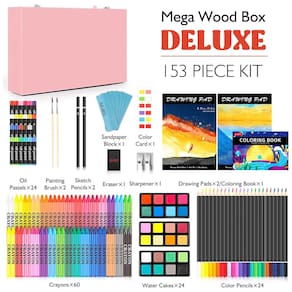 Este conjunto de arte All in One Deluxe tem tudo o que você precisa para começar a criar em um estojo de madeira compacto Inclui todos os tipos de materiais para colorir e desenhar para artistas de todas as idades, como lápis de cor, giz de cera, pastéis, marcadores, 2 blocos de desenho, 1 livro de colorir e aquarelas. É o kit de arte perfeito para um artista iniciante e aspirante que adora explorar e experimentar s e diferentes meios de arte. Presenteie este kit de desenho para adultos, crianças e adolescentes, equipando os com seus primeiros conjuntos de arte.