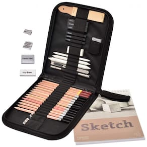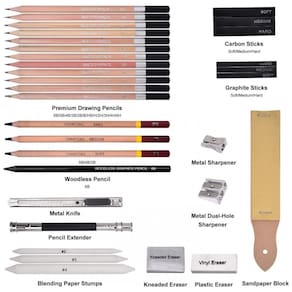 Atende a todas as necessidades O kit de lápis de desenho de 33 peças inclui 12 lápis de grafite 5H,4H,3H,2H,HB,B,2B,3B,4B,5B,6B, 6H, bloco de desenho de 1x50 folhas, 3 lápis de carvão soft , médio, duro, 3 tocos de papel de mistura, 1 extensor de lápis de cabeça dupla, 1 faca de metal, 3 bastões de carvão, 3 bastões de grafite, 1 bloco de lixa, 1 borracha de vinil, 1 borracha amassada, 1 apontador de dois furos, 1 único Apontador de lápis de furo, 1 estojo de transporte com zíper.