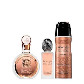 O Kit Lattafa Fakhar Women Feminino - Eau de Parfum 100ml e Deodorant 200ml e Hair Mist 50ml é ideal para quem busca uma fragrância floral frutada sedutora e versátil, perfeita para encontros românticos, eventos sofisticados, noites especiais e climas frios.