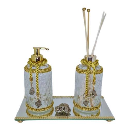 Kit lavabo pedra natural difusor saboneteira-escolha a pedra Cor: pirita dourada Kit lavabo pedra natural difusor saboneteira-escolha a pedra escolha uma das cores disponíveis na opção cor do próprio anúncio. - turmalina negra: é uma pedra natural de proteção, limpeza, purificação e transformação das energias do ambiente. Essa pedra vai te proteger contra o mau-olhado e todas as energias negativas que de alguma forma atingirem o seu lar. Blinda o seu ambiente da sobrecarga energética e dispersa toda a tensão e o do ambiente. - pirita dourada: a pedra pirita é muito conhecida pela sua força em atrair prosperidade e é muito Utilizado por aqueles que procuram sucesso , bens materiais, abertura de caminhos. Traz a energia da prosperidade intensa ao ambiente que se encontra. - ametista roxa: a pedra ametista é o cristal da paz, da evolução espiritual e da conscientização. É uma pedra , pois ajuda a controlar os vícios, os maus hábitos, a dor, a ansiedade e a insônia. Estimula a entrada e aprofundamento em assuntos de espiritualidade, eleva o padrão vibratório da aura, dando equilíbrio geral e harmonia. Traz paz e equilíbrio ao ambiente. - quartzo verde: o quartzo verde é considerado a pedra da cura pelas propriedades calmantes e desintoxicantes de sua cor. Ele é capaz de acalmar o corpo, mente e coração, aumentando nossa paciência, favorecendo o equilíbrio emocional, sensação de bem-estar e também o sono. - sodalita azul: a sodalita é uma pedra de elevação espiritual, meditação e proteção energética. Também fortalece a mente, aumenta a intuição, facilita a meditação. As vibrações da pedra sodalita ajudam a expandir nossa consciência espiritual, acalmam as emoções e equilibram nossa energia mental. O kit lavabo é composto por uma pedra natural turmalina negra tamanho médio além dos pingentes de pedras turmalinas pequenas, bandeja espelhada, saboneteira e difusor, sendo que todas as peças são de vidro e decoradas de forma artesanal proporcionando requinte e delicadeza em peças de beleza única. Enviamos seu pedido em até 24 horas após a confirmação de pagamento Marca: Não Informado Ean: 7894135787829