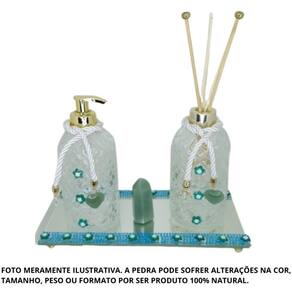 Kit lavabo pedra natural difusor saboneteira-escolha a pedra Cor: quartzo verde Kit lavabo pedra natural difusor saboneteira-escolha a pedra escolha uma das cores disponíveis na opção cor do próprio anúncio. - turmalina negra: é uma pedra natural de proteção, limpeza, purificação e transformação das energias do ambiente. Essa pedra vai te proteger contra o mau-olhado e todas as energias negativas que de alguma forma atingirem o seu lar. Blinda o seu ambiente da sobrecarga energética e dispersa toda a tensão e o do ambiente. - pirita dourada: a pedra pirita é muito conhecida pela sua força em atrair prosperidade e é muito Utilizado por aqueles que procuram sucesso , bens materiais, abertura de caminhos. Traz a energia da prosperidade intensa ao ambiente que se encontra. - ametista roxa: a pedra ametista é o cristal da paz, da evolução espiritual e da conscientização. É uma pedra , pois ajuda a controlar os vícios, os maus hábitos, a dor, a ansiedade e a insônia. Estimula a entrada e aprofundamento em assuntos de espiritualidade, eleva o padrão vibratório da aura, dando equilíbrio geral e harmonia. Traz paz e equilíbrio ao ambiente. - quartzo verde: o quartzo verde é considerado a pedra da cura pelas propriedades calmantes e desintoxicantes de sua cor. Ele é capaz de acalmar o corpo, mente e coração, aumentando nossa paciência, favorecendo o equilíbrio emocional, sensação de bem-estar e também o sono. - sodalita azul: a sodalita é uma pedra de elevação espiritual, meditação e proteção energética. Também fortalece a mente, aumenta a intuição, facilita a meditação. As vibrações da pedra sodalita ajudam a expandir nossa consciência espiritual, acalmam as emoções e equilibram nossa energia mental. O kit lavabo é composto por uma pedra natural turmalina negra tamanho médio além dos pingentes de pedras turmalinas pequenas, bandeja espelhada, saboneteira e difusor, sendo que todas as peças são de vidro e decoradas de forma artesanal proporcionando requinte e delicadeza em peças de beleza única. Enviamos seu pedido em até 24 horas após a confirmação de pagamento Marca: Não Informado Ean: 7894135787805