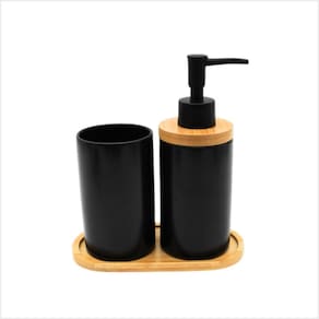 Simplicidade que encanta Se você acredita que menos é mais, o este Kit Lavabo Minimalista é a escolha certa. Com um design liso, sem texturas e de acabamento impecável, ele traz uma sofisticação discreta, adaptando-se perfeitamente a qualquer estilo de decoração. Seu toque fosco e aveludado transmite elegância, enquanto a combinação com a base de bambu reforça a harmonia e o equilíbrio do ambiente. Por que você vai amar esse modelo -design clean e atemporal, perfeito para qualquer decoração -Acabamento fosco que transmite sofisticação sem excessos -Estilo versátil, ideal para lavabos clássicos ou contemporâneos Para quem valoriza sofisticação sutil e uma estética minimalista. Especificações Técnicas:Cor: Preto- Porta Sabonete LíquidoMaterial: Porcelana e BambuMedidas Aproximadas: Altura: 12 cm x Diâmetro: 7cm- Porta ObjetosMaterial: Porcelana e BambuMedidas Aproximadas: Altura: 10 cm x Diâmetro: 7cm- Bandeja:Material: Porcelana e BambuMedidas Aproximadas: Altura: 0,9 cm x Largura: 9 cm x Comprimento: 17 cmImagens IlustrativasComposição da Embalagem:1 Porta Sabonete Líquido1 Porta Objetos1 Bandeja Marca: Não Informado