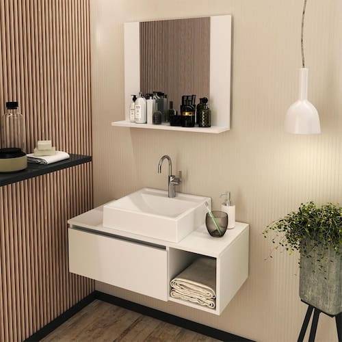 O Kit para Banheiro é a escolha ideal para dar um toque de elegância e organização ao seu espaço. Com um design contemporâneo, ele transforma o ambiente em um local mais convidativo e prático. Fabricado com materiais de alta qualidade, o kit oferece durabilidade e um visual sofisticado, tornando seu banheiro ainda mais funcional e bonito. CARACTERÍSTICAS TÉCNICAS: - Produzida em MDP de 15 mm - Acabamento UV na cor Branco - Acompanha Espelho - Cuba em Mármore Sintético - Porta Basculante com Dobradiça e Articulador - Balcão Suspenso - Puxador tipo Cava *Kit Composto por Gabinete Suspenso (3601), Espelheira (3610) e Cuba (3630) INFORMAÇÕES TÉCNICAS: 3601: Alt. 26,5 x Larg. 80 x Prof. 38,7 cm P. 10,8 kg 3610: Alt. 54 cm x Larg. 60 cm x Prof. 15,6 cm x P. 6,35 3630: Alt. 11,5 x Larg. 35 x Prof. 34 cm P. 5,5 kg INFORMAÇÕES ADICIONAIS: - ATENÇÃO: Não trabalhamos e não nos responsabilizamos pela montagem do móvel. Antes da montagem conferir se o produto está de acordo com o que comprou, produto montado e danificado pela montagem não será aceito troca. Montagem e instalação por conta do comprador. - As imagens ambientadas são meramente ilustrativas e podem apresentar itens que não compõe o produto. As cores do produto podem variar de acordo com o monitor, a iluminação do ambiente ou sua percepção visual. - Limpeza: Deve ser feita com pano macio e seco ou levemente umedecido com água e sabão neutro. Não devem ser utilizados abrasivos como palha de aço e objetos cortantes. -Garantia para defeitos de fabricação conforme Código de Defesa do Consumidor.