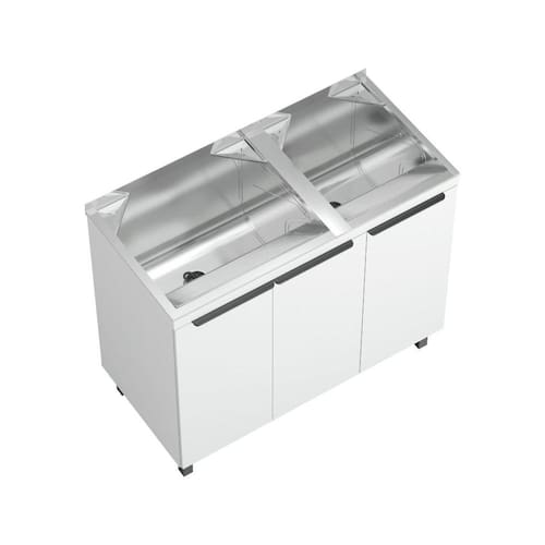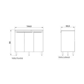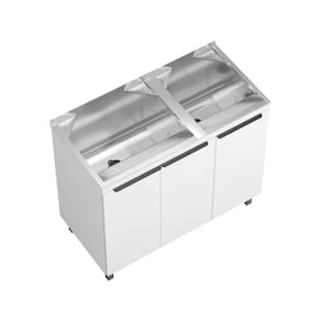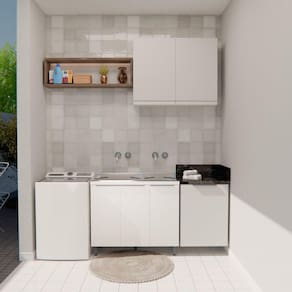 Este kit inclui um tanque duplo com capacidade de 114 litros, a maior profundidade do mercado. O balcão é amplo, com uma prateleira projetada com encaixe inteligente para o sifão e para acomodar baldes e uma grande quantidade de produtos de limpeza.