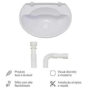 Kit Lavatório Plástico + Sifão Branco Kit Lavatório Branco com Sifão Flexível - Valeplast Tenha praticidade, qualidade e economia com este conjunto funcional para lavatório Ideal para banheiros e lavabos residenciais ou comerciais, o kit inclui um lavatório branco e sifão flexível para uma instalação simples, segura e durável. Fabricado em materiais de alta resistência, o lavatório em plástico branco da Valeplast oferece leveza, durabilidade e um visual moderno. O sifão flexível garante vedação eficiente e fácil adaptação aos pontos de esgoto. Imagens meramente ilustrativas. ESPECIFICAÇÕES TÉCNICAS: Lavatório: Plástico resistente, cor branca Sifão: Flexível, plástico corrugado, alta resistência FUNÇÕES E CARACTERÍSTICAS: Produto leve e durável Visual discreto e moderno Sifão com alta flexibilidade Instalação simples e rápida Ideal para lavabos, banheiros e áreas de serviço COMPATIBILIDADE: Compatível com instalações padrão Indicado para banheiros residenciais e comerciais INSTRUÇÕES DE USO: Fixe o lavatório na parede de acordo com os pontos de ancoragem. Conecte o sifão à saída da cuba e ao ponto de esgoto. ITENS INCLUSOS: 1 Lavatório branco em plástico Valeplast 1 Sifão flexível DETALHAMENTO DE : do vendedor: 3 meses contra defeitos de fabricação Garanta já seu Kit Lavatório com Sifão e transforme seu ambiente com praticidade e qualidade