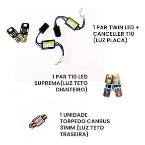 - par de twin led t10 canbus + canceller t10 luz de placa ; - par de t10 led suprema luz de teto dianteira ; - 1 unidade de torpedo canbus 31mm luz de teto traseira ;