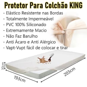 Kit lençol capa protetor impermeável com elástico colchão king + 2 fronha Neste kit conteúdo: 1 protetor king size com elastico cor bege. 2 fronha protetor de travesseiro O protetor para colchão siliconizado com elástico senior care, protege totalmente o colchão do suor, umidade e líquido, evita a proliferação de ácaros e fungos preservando o conforto e protegendo sua saúde. Ideal para incontinência urinária. Toque suave. Diferenciais: - não esquenta e não faz barulho; - antialérgico; - antiácaro; - lavável; - impermeável; - com elástico. Indicações - idosos; - bebes, crianças desfraude ; - pne's portadores de necessidades especiais; - incontinência urinária; - hotéis, pensões, casa de repouso, clínicas e hospitais. Tamanho: King size 193 l x 203 c x 30 a cm Composição: confeccionado em plástico pvc 100% siliconizado com elástico de 14,5mm na borda, sistema vapt-vupt. Fronha 70cm x 52cm. Composição: 100% pvc siliconado. com zipper lateral facilitando a colocação. cor: bege. - o material é plástico Não, o material pela senior care na confecção do nosso modelo vapt vupt é o pvc siliconizado. - quando forrado por cima escorrega Depende muito do tecido, mas se for algodão não escorregará. - faz muito barulho Não, eles são confeccionados em pvc siliconizado além de dar um toque muito macio possibilita que o lençol seja extremamente silencioso. Marca: Não Informado