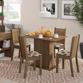 - Itens Inclusos: 1 mesa de madeira com pé pedestal e tampo em madeira e 4 cadeiras de madeira com assento estofado na cor Floral Hibiscos.