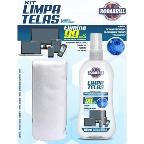 LIMPA TELAS RODABRILL limpa todas as superfícies de cristal líquido removendo marcas de dedo, poeira e gordura, além de eliminar 99,999% das bactérias e micróbios acumulados. Pode ser aplicado em tablets, TVs (exceto Plasma), GPS, celulares, notebooks, câmeras digitais e monitores em geral. Pode ser utilizado em todos os tipos de superfícies incluindo acabamento black piano, capas de borracha e silicone.