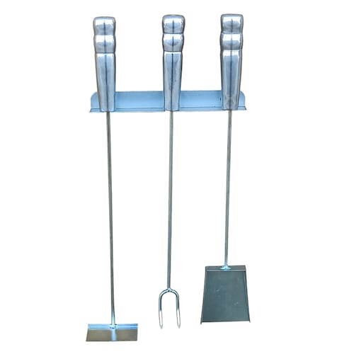 Caixa contém: 1 garfo churrasqueiro 49 cm; 1 rastelo espalhador de brasa 49 cm; 1 pá de limpeza 49 cm 1 suporte de parede.
