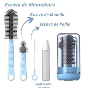 Contém escovas de diferentes tamanhos e formatos, ideais para limpar com eficiência desde bicos de mamadeira até garrafas maiores.