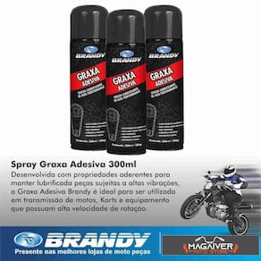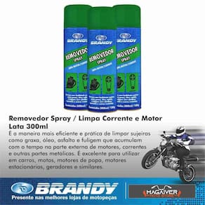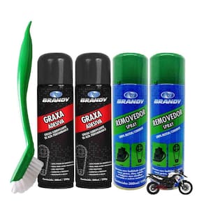 Kit limpeza moto 2 removedor graxa limpa motor + 2 graxa adesiva 300ml + 1 escova limpa corrente Kit com:2 removedor brandy spray limpa corrente e motor lata 300ml/180g + 2 graxa brandy adesiva spray lata 300ml/220g + 1 escova dura brilhus bettanin limpa cantos azulejos e correntes ========================================Sobre o removedor brandy spray limpa corrente e motor lata 300ml/180g É a maneira mais eficiente e prática de limpar sujeiras como graxa, óleo, asfalto e fuligem que acumulam com o tempo na parte externa de motores, correntes e outras partes metálicas. É excelente para utilizar em carros, motos, motores de popa, motores estacionários, geradores e similares. Lata 300ml / 180g========================================Sobre a graxa brandy adesiva spray lata 300ml/220g Desenvolvida com propriedades aderentes para manter lubrificada peças sujeitas a altas vibrações, a graxa adesiva brandy é ideal para ser utilizada em transmissão de motos, karts e equipamento que possuam alta velocidade de rotação. Lata 300ml / 220g========================================Sobre a escova dura brilhus bettanin limpa cantos azulejos e correntes A escova dura brilhus bettanin limpa cantos azulejos e correntes possui ponta raspadora de sujeiras mais difíceis. É ideal para limpar cantos de parede, azulejos, correntes de bicicleta e de moto. Possui cerdas estreitas, mais duras e resistentes para limpar sem danificar. Material: estrutura plástica resistente de longa duração. Marca: Brandy / Brilhus Bettanin