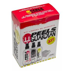O Kit Peels Guardian para limpeza do capacete acompanha 03 frascos de 100ml, sendo: Limpa capacete, limpa viseira, anti odor e 02 panos de microfibras.