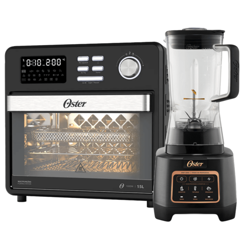Características Gerais do produto Kit Oster cometros Liquidificador Xtremetrose Mix (2L, 1500W, Titaniumetros Blade, programetrosas iBlend) e Forno Fryer Multifunções Cometrospact (15L, 1600W, 21 funções, Turbo Convection).