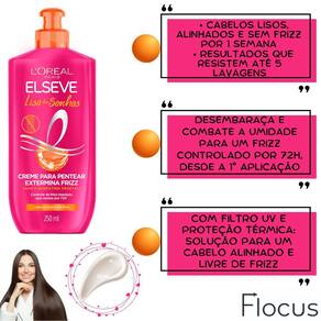 Kit Liso dos Sonhos Sérum Leave In Extraordinário Elseve Bem vindo a a loja Flocus. É um prazer tê-lo a como nosso a cliente CONTEÚDO DO KIT: 1 Elseve Shampoo Super Alinhador Liso dos Sonhos Loreal Paris - 400ml 1 Elseve Condicionador Efeito Liquid Hair Liso dos Sonhos Loreal Paris - 400ml 1 Elseve Creme para Pentear Extermina Frizz Liso dos Sonhos Loreal Paris - 250ml 1 Elseve Sérum Leave-in Liso Por 1 Semana Liso dos Sonhos L'oreal Paris - 100ml 1 Óleo Extraordinário L'Oréal Paris Elseve - 100ml Chegooou A nova linha Elseve Liso dos Sonhos proporciona cabelos lisos, alinhados e sem frizz por 1 semana O Shampoo Super Alinhador limpa e fortalece a fibra preparando os fios para um liso de longa duração e com frizz controlado. O Condicionador Efeito Liquid Hair sela e restaura a superfície da fibra para um liso com efeito liquid hair: desmaiado, com movimento superfluido e brilho intenso. O Creme para pentear Extermina Frizz desembaraça e combate a umidade para um liso com frizz controlado por até 72h, desde a primeira aplicação. Com filtro UV e proteção térmica, o Creme para Pentear Extermina Frizz é a solução para um cabelo alinhado e livre de frizz. O Sérum Leave-in LOréal Paris Elseve Liso dos Sonhos é um finalizador capilar desenvolvido para quem deseja um cabelo mais liso, alinhado e protegido contra a umidade. Sua tecnologia ativada por calor cria uma barreira invisível na fibra capilar, proporcionando um efeito de cabelos lisos por até 1 semana. Resultados que resistem até 5 lavagens Para turbinar seu tratamento capilar, o kit contém o famoso e um dos mais vendidos Óleo de Tratamento Elseve Óleo Extraordinário Nutrição, pois ele tem a combinação perfeita de micro-óleos de flores preciosas, garantindo maciez e brilho aos cabelos. O segredo dos óleos de flores preciosas promovem uma nutrição perfeita e uma leveza infinita. Camomila Linhaça Girassol Gardênia Lótus Rosa Canina INDICAÇÃO: Cabelos naturalmente lisos, alisados e com frizz. MODO DE USO: Shampoo: Aplique em todo o comprimento, até as pontas. Deixe o produto agir e enxágue abundantemente. Condicionador: Aplique nos cabelos molhados Massageie suavemente e enxágue. Repita a aplicação se necessário. Creme para Pentear: Aplique no cabelo úmido ou seco Não enxágue. Penteie como de costume. Leave-in: aplique somente nos cabelos úmidos, do comprimento as pontas cobrindo todos os fios. na 1 aplicação da semana, ative a fórmula com a chapinha após a secagem. ao longo da semana, após cada lavagem reaplique e ative somente com o secador. esqueça a chapinha por 1 semana. agite antes de usar. Óleo Extraordinário: O Óleo Extraordinário de tratamento é leve e multiuso, pode ser tanto em cabelos molhados quanto secos pode ser antes da escova para nutrir os fios; como finalizador para malear a fibra; em qualquer momento para disciplinar o frizz e ressaltar a luz dos cabelos. Agradecemos por escolher a Loja Flocus e por confiar em nós para cuidar da beleza dos seus cabelos. Em caso de dúvidas, favor enviar sua pergunta Flocus