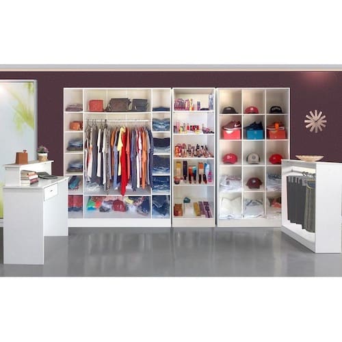 - Colméia Ana: expositor com nicho, prateleiras e cabideiro.