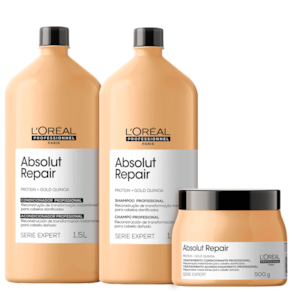 Kit de tratamento em tamanho salão para cabelos danificados. O Kit L'Oréal Professionnel Serie Expert Absolut Repair Gold Quinoa + Protein Salon Trio reestrutura os fios de maneira leve para que fiquem brilhantes, macios e controlados.