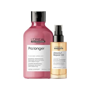 Kit L'Oréal Professionnel Serie Expert Pro Longer foi criado para cabelos longos com pontas afinadas ou danificadas. O novo Serie Expert Pro Longer é o tratamento profissional preenchedor de pontas para um cabelo mais longo, denso e com brilho. A linha conta com a tecnologia de preenchimento Filler-A100 que faz com que o produto penetre no núcleo da fibra capilar para preencher e densificar a estrutura do cabelo por dentro enquanto os aminoácidos trabalham para fortalecer o cabelo pelo lado de fora. Com o Kit L'Oréal Professionnel Serie Expert Pro Longer conquistar o cabelo longo vai ser uma realidade Resultado:força SUGESTÃO DE USO:Shampoo1. Aplique o shampoo sobre o cabelo molhado;2. Massageie com suavidade;3. Enxágue e, se necessário, repita o processo.Óleo1. Aplique uma pequena quantidade do sérum no cabelo seco;2. Espalhe uniformemente pelos comprimentos e pontas médias e não enxágue;3. Finalize como desejar. Observações:imagem Meramente Ilustrativa. ITENS INCLUSOS: 1 Shampoo L'Oréal Professionnel Serie Expert Pro Longer 300 ml1 Óleo Capilar L'Oréal Professionnel Serie Expert Absolut Repair Gold Quinoa Protein 10 in 1 90 ml