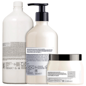 Kit L'Oréal Professionnel Metal Detox Trio com shampoo, máscara hidratante e tratamento capilar. Indicado para cabelos coloridos ou com mechas.