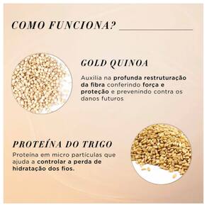 Gold Quinoa + Proteína: tecnologia rica em quinoa dourada. Possui estrutura interna com 9 aminoácidos essenciais que reparam os fios. Além disso, tem ação antioxidante da vitamina E, que nutre e protege os fios dos danos externos devido à presença do complexo B.