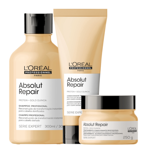 Kit de tratamento para cabelos danificados. O Kit L'Oréal Professionnel Serie Expert Absolut Repair Gold Quinoa + Protein Trio possui fórmula rica que restaura completamente os fios para recuperar sua saúde e ganhar brilho, maciez e leveza.