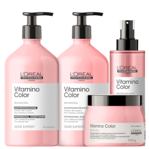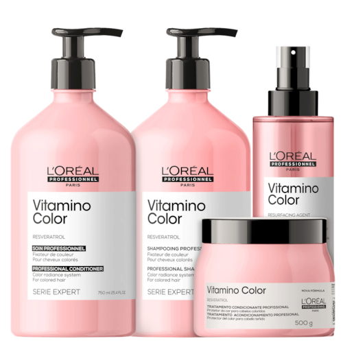 Kit com shampoo, condicionador, máscara e leave-in para cabelos coloridos. L’Oréal Professionnel Serie Expert Vitamino Color apresenta um tratamento completo para manutenção da cor, ideal para a rotina de haircare de cabelos coloridos.
