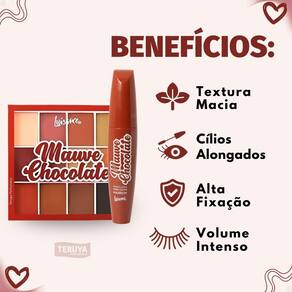 A paleta de sombras Mauve Chocolate apresenta uma fórmula altamente pigmentada com acabamentos matte, acetinado e brilhante, garantindo uma aplicação suave e de longa duração. Complementando, a máscara para cílios marrom proporciona alongamento e volume, realçando seus cílios com um toque natural e elegante. É o kit essencial para quem busca maquiagem de olhos completa e de alta performance.