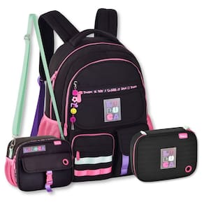 Disponível em três cores tendência - rosa, lilás e preta -, esse kit é ideal para combinar com qualquer look, seja no dia a dia escolar ou em momentos especiais.