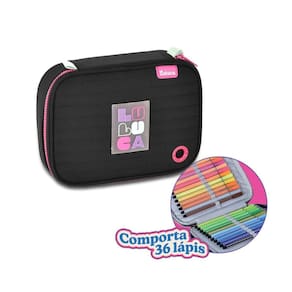 Este estojo box estruturado acomoda até 36 lápis ou canetas com seus elásticos internos, além de contar com um estojo extra com zíper para separar os itens.