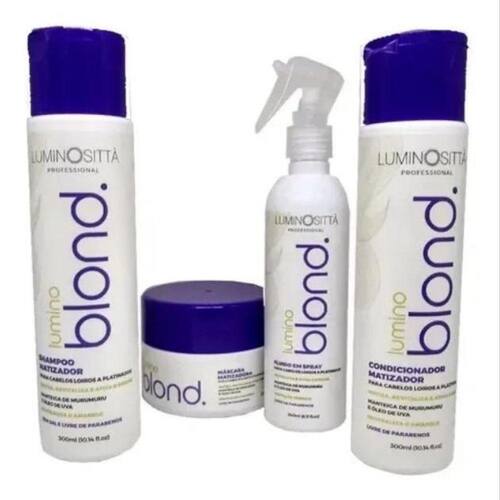 Kit matizador loiros a platinados sem sal e livre de parabenos lumi blond luminosittá.Desenvolvido para : matizar, revitalizar ativar ob rilho e neutralizar o amarelo.Shampoo lumino blond , foi especialmente desenvolvido para dar neutralidade aos tons amarelados sem ressecar os fios.Conta com o rico tratamento da manteiga de murumuru e óleo de uva, deixando-os tratados e com um brilho espetacular .Condicionador lumino blond, tem sua fórmula especialmente desenvolvidos para neutraliza os tons amarelados nos fios.Conta com a rica nutrição promovida pela manteiga de murumuru e o óleo de uva, garantido cabelos nutridos e com brilho fantástico.Máscara matizante lumino blond, essa vai conquistar você . A sua proposta de neutralização dos tons amarelados é realmente diferenciado. Com os pigmentos especiais elaborados para trazer , cor , brilho e nutrição intensiva através da associação de manteiga de murumuru e do óleo de uva tratando por completo os fios descoloridos.Fluído em spray lumino blond proteção térmica, com o poder da manteiga de murumuru e do óleo de uva ele foi desenvolvido para tratar intensamente fios danificados por processos de descoloração , além da proteção térmica para total segurança dos cabelos fragilizados.Shampoo 300 ml anvisa proc: 25351.673282/2018-47Condicionador 300 ml anvisa proc: 25351.673290/2018-93 Máscara matizante 250 gramas anvisa proc: 25351.673280/2018-58 Fluído em spray 240 ml anvisa proc: 25351.673313/2018-20 Imagens ilustrativas.