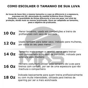 Costumamos chamar de "tamanho das luvas", mas o termo correto é peso. O boxe, cuja origem está na Inglaterra, utiliza historicamente a medida de peso daquele país, que são as onças (oz). Vamos ao que interessa, que é como escolher o tamanho (peso) da sua Luva de Boxe MKS Champions III.
