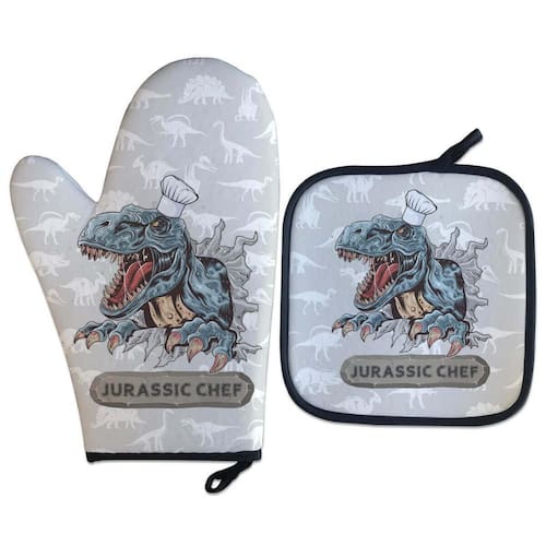 Kit Luva Térmica Dinossauro Jurassic Chef Cozinha Criativa Cor: Cinza O kit Luva Térmica Dinossauro Jurassic Chef Cozinha Criativa é uma ótima adição para a sua decoração e um ótimo presente para quem ama esses répteis jurássicos. O kit acompanha uma luva térmica e um aparador, para te ajudar na hora de pegar suas panelas e formas quentes. Especificações: