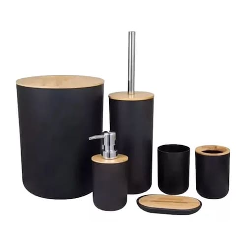 Kit Luxo Bambú Banheiro 6 Peças 7122 Preto Kit Conjunto para banheiro Bambu 6 Peças, produzido em polipropileno atóxico com acabamento em Bambu, trás elegância ao ambiente! Fácil para limpar e resistente a umidade, une beleza e praticidade para deixar seu banheiro mais bonito e completo É composto de 6 peças: Lixeira: 19,5 x 28,0 cm, Escova Sanitária com suporte: 12,0 x 32,0 cm, Dispenser de Loção: 7,2 x 16,0 cm, Copo: 7,2 x 10,0 cm, Porta escova de dentes : 7,2 x 10,5 cm, Saboneteira: 8,5 x 13,3 cm Material: Polipropileno e Bambu