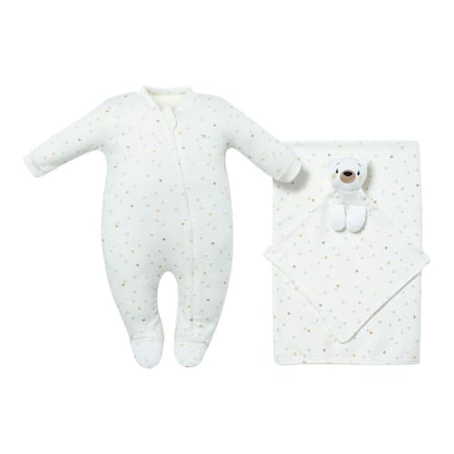 O Kit Macacão + Cueiro + Naninha da Hug é a opção completa para proporcionar conforto e aconchego ao bebê. Com um macacão macio e delicado, ideal para a pele sensível, um cueiro que oferece proteção e segurança nos momentos de descanso e uma naninha fofa para acalmar e acompanhar o bebê, o kit traz praticidade e carinho ao dia a dia. Cada peça é feita com a qualidade e cuidado que a Hug oferece, pensando sempre no bem-estar dos pequenos. DIFERENCIAIS Nossas malhas 100% algodão passam por rigorosos processos de qualidade. Selecionamos fios de algodão com fibras longas e de altíssima qualidade, proporcionando um toque suave e duradouro em nossos suedines. Nossas tecelagens utilizam teares modernos que transformam os melhores fios em malhas estáveis, duradouras e confortáveis, com um nível ideal de gramatura, permitindo uma troca de temperatura natural e saudável entre a pele sensível do bebê e o ambiente. Nossas estampas digitais são produzidas com os métodos mais modernos do mundo, resultando em desenhos autorais com traços delicados e suaves. As tintas utilizadas possuem certificação OEKO-TEX® ECO PASSPORT e são à base de água, tornando o processo totalmente ecológico e seguro para a pele humana. Isso nos permite economizar até 95% dos recursos ambientais em comparação com outros métodos tradicionais da indústria têxtil. - Estampa exclusiva HUG Macacão com zíper CARACTERISTICAS Gênero: Unissex Cor: Off White Composição: Suedine 100% algodão