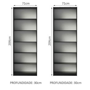 Medidas totais de cada estante: 204 cm de altura x 71 cm largura x 30 cm de profundidade.