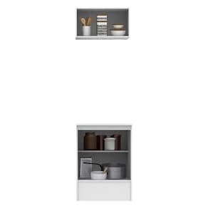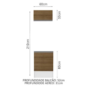 Itens inclusos: - Um (1) balcão de 83 cm de altura, 60 cm de largura e 52 cm de profundidade com tampo e uma (1) porta. - Um (1) aéreo de 33 cm de altura, 60 cm de largura e 31 cm de profundidade com porta basculante.